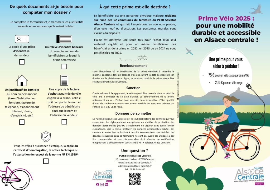 En 2025, le PETR Sélestat Alsace Centrale lance un dispositif d’aide à l’achat d’un vélo sur le territoire : 75€ pour un vélo classique ou un vélo à assistance électrique, 200€ pour un vélo cargo.