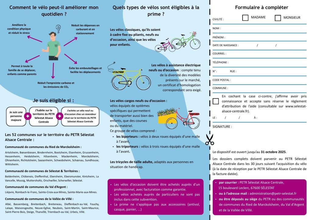 Pour consulter le règlement, la liste des vélos éligibles et le formulaire, rendez-vous sur le site du PETR Sélestat Alsace Centrale : www.selestat-alsace-centrale.fr