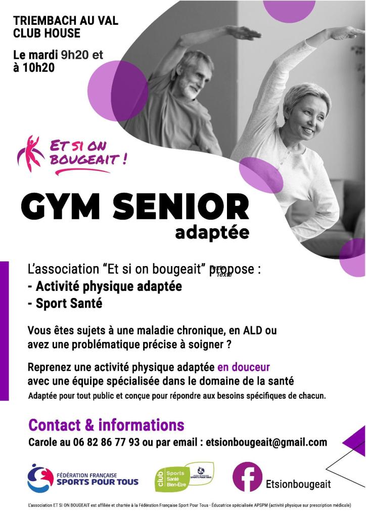 - GYM SENIOR adaptée : le mardi de 9h20 à 10h20 et de 10h20 à 11h20