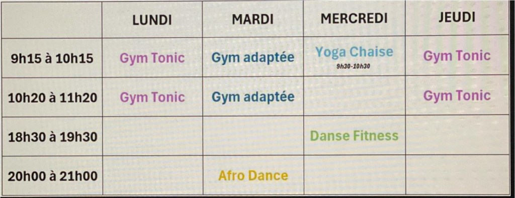- GYM TONIC :le lundi et le jeudi de 9h15 à 10h15 et de 10h20 à 11h20