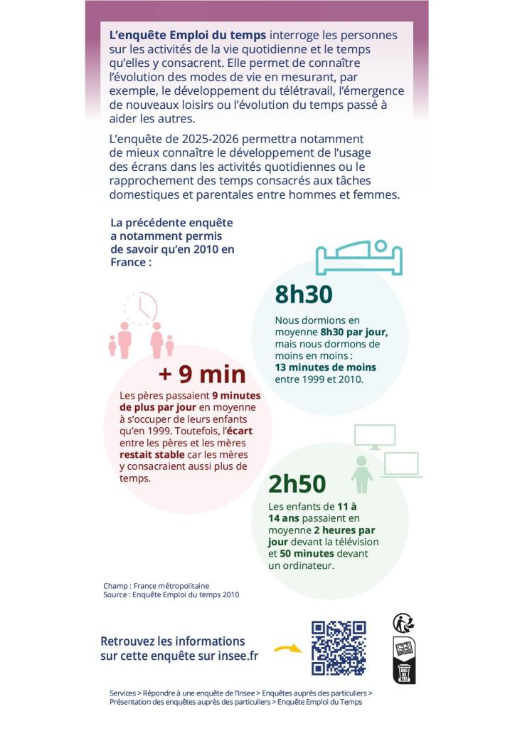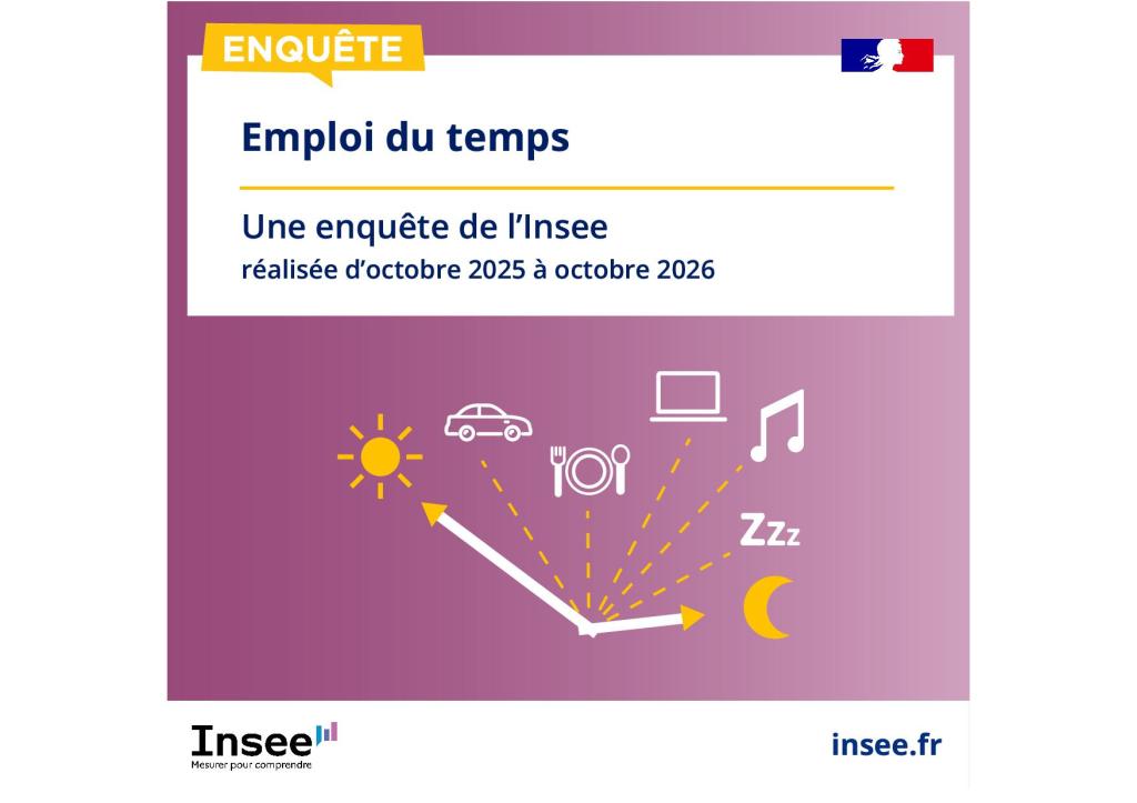 L’Institut national de la statistique et des études économiques (INSEE) réalise au cours des années 2025 et 2026 une enquête sur le thème de l’emploi du temps.