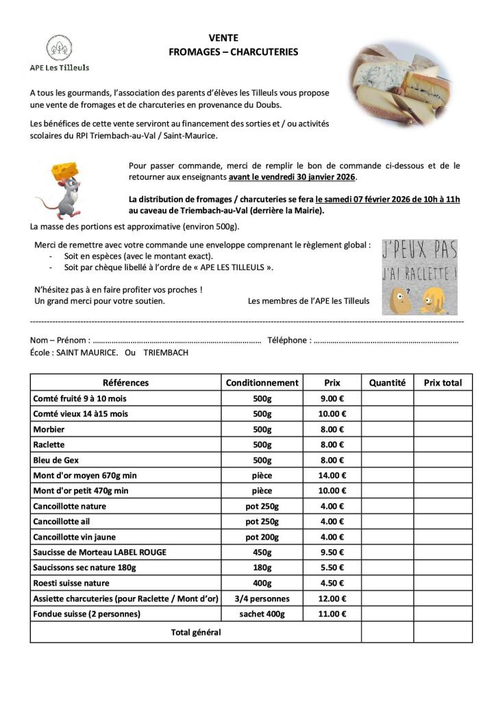 L’APE les Tilleuls organise une vente de fromages / charcuteries au profit des élèves de Triembach-au-Val / Saint-Maurice.